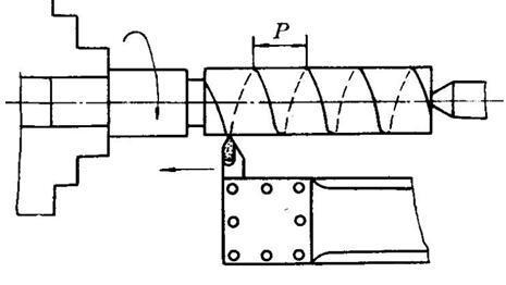 數(shù)控車床與普通車床車削螺紋的原理一樣:工件旋轉(zhuǎn),車刀沿工件軸線方向作等速移動,并保持工件轉(zhuǎn)一周,刀具移動一個導(dǎo)程的距離,如圖
