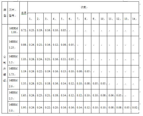 另外還有一個表格關(guān)于螺紋的牙深的就是總切削深度,加工螺紋時,牙型不可能一刀車削完成,往往需要分好幾次切削,總的分配原則是,切削深度由大到小,可以根據(jù)下表
