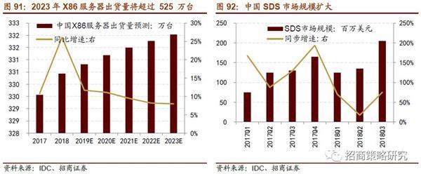 服務(wù)器和存儲等云計算產(chǎn)業(yè)鏈前端設(shè)施逐漸適應(yīng)行業(yè)變革,國內(nèi)云計算產(chǎn)能擴(kuò)張已形成模式。根據(jù)IDC發(fā)布的全球服務(wù)器市場報告,我國服務(wù)器銷售額增速全球領(lǐng)先,低端X86占據(jù)服務(wù)器市場絕對優(yōu)勢,高需求帶動服務(wù)器價格攀升,同時拉動了服務(wù)器營收增長。2018 年全年中國 X86 服務(wù)器市場出貨量為3,304,300 臺,同比增長 26.1%;市場規(guī)模為 171.89 億美元(約合人民幣1,151.95 億元),同比增長 54.9%。IDC 預(yù)測,到 2023 年中國 X86 服務(wù)器出貨量將超過 525 萬臺,未來 5 年整體市場年復(fù)合增長率(CAGR)為 9.7%。
