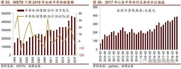 全球半導(dǎo)體行業(yè)庫存水位偏高,短期去庫存將影響半導(dǎo)體市場景氣度。2016年,全球存儲器行業(yè)處于上行周期,存儲器價格在2017年Q3達(dá)到了周期的高點,三星、鎂光等存儲器巨頭紛紛擴(kuò)充產(chǎn)能,導(dǎo)致存儲器供過于求,存儲器價格持續(xù)走低,拖累全球半導(dǎo)體市場。在2016年Q4之后,全球半導(dǎo)體存貨快速提升,2018年到超過350億美元,處于歷史較高水平。由于庫存較高以及需求不及預(yù)期,世界半導(dǎo)體貿(mào)易統(tǒng)計組織(WSTS)下調(diào)了全球半導(dǎo)體銷售額,將2019年全球半導(dǎo)體預(yù)計銷售額從4901.42億美元下調(diào)至4545.47億美元,同比增速也從增長2.6%下調(diào)至下滑3%。