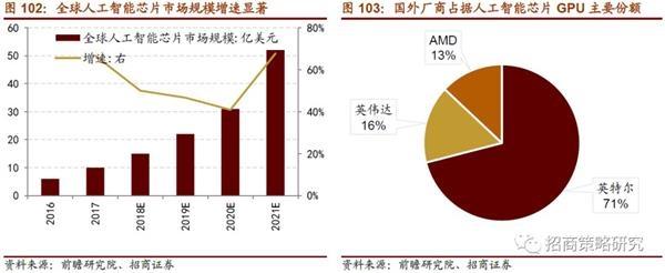 數(shù)據(jù)規(guī)模巨大和算法復(fù)雜度對芯片的要求越來越高,運算速度和穩(wěn)定性成為芯片研發(fā)的關(guān)鍵指標(biāo)。傳統(tǒng)的CPU芯片無法高效處理并行計算,且對不同的算法,芯片的設(shè)計要求也不同,定制化芯片應(yīng)運而生。目前人工智能芯片市場仍被因特爾和英偉達(dá)等海外巨頭占據(jù)。據(jù)前瞻產(chǎn)業(yè)研究院統(tǒng)計,全球人工智能芯片2021年市場規(guī)模將達(dá)到52億美元,年復(fù)合增長率達(dá)到53%。國內(nèi)華為、寒武紀(jì)、阿里巴巴、比特大陸、百度等企業(yè)都在加速研發(fā)可定制化的AI芯片。其中寒武紀(jì)MLU 100PCIe 智能處理卡將于2019年量產(chǎn),比特大陸 SOPHON芯片計劃于2H19量產(chǎn)。