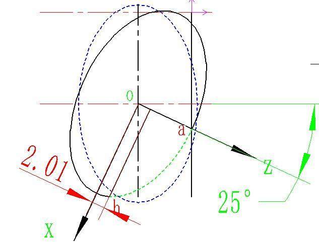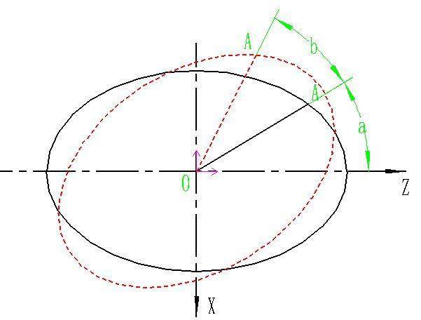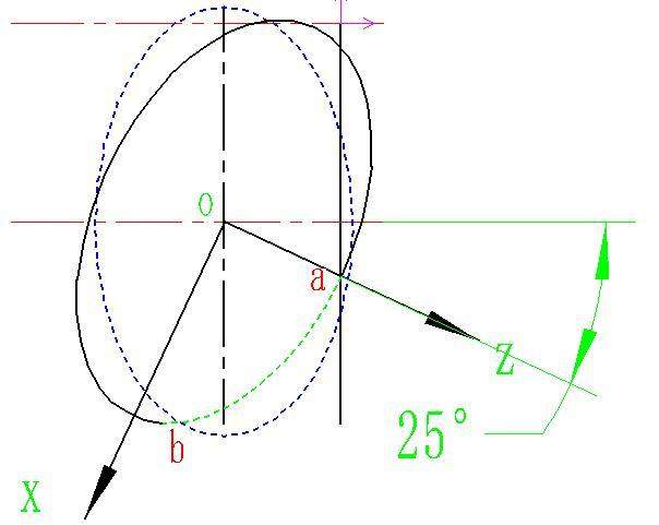 通常在數(shù)控車削中,我們通常把Z作為自變量,所以按照上面的公式我們只要找出被加工部分橢圓的起點和終點Z坐標(biāo)即可,這個起點和終點坐標(biāo)一定要是在未旋轉(zhuǎn)橢圓坐標(biāo)系中的,所以按照旋轉(zhuǎn)的角度大家把坐標(biāo)系建立一下,如下圖所示