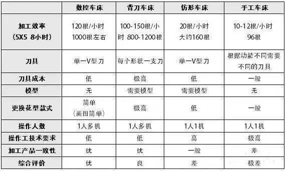 各位木制品加工老板都知道木工車床主要有:手把刀加工(人工加工)方式;仿形車床加工;背刀車床加工;以及目前市場效率最高的數(shù)控木工車床加工。下表分析了一下各種木工車床的性能對比 :